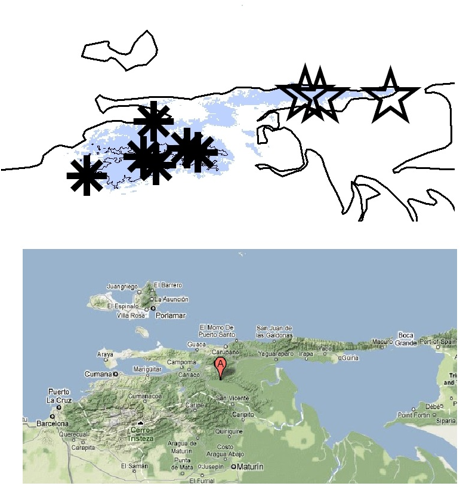 Comments from Thomas Donegan: “The map below shows all known specimen or sound recording localities (asterisks for subspecies cumanensis and stars for subspecies pariae) and modeled range (in blue) for cumanensis based on a close-up of the map published in Donegan (2008). Below that is a Google map on a similar scale showing state boundaries with a white dotted line. Sucre state includes all the land in the section marked “A”. As can be seen, a great majority (70-80%?) of the modeled range of cumanensis occurs in Sucre state. The southern bit of the montane population marked with asterisks falls outside this, and a tiny part of the westernmost range also falls outside the state. Given that Ecuadorian Tyrannulet and Venezuelan Tyrannulet both also occur in Colombia; and Canada Warbler occurs all over the place, I am not sure that Sucre Antpitta is such a bad geographical name.
