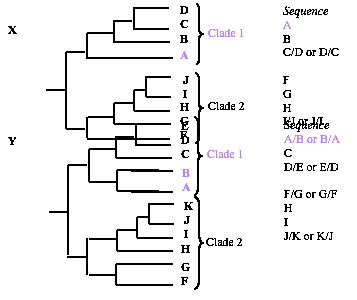 (taxon A and F in X; A/B and F/G in Y), the less diverse clade is arranged