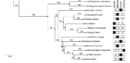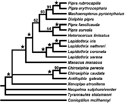 other two is consistent with all of the topologies.  The remaining genera, Pipra,