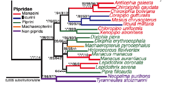 the manakins (Aves: Pipridae). Molecular Phylogenetics and Evolution 55:733-737.