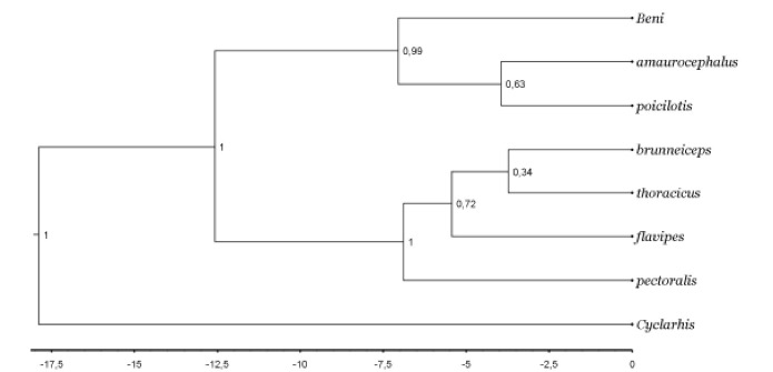 with low nodal support) and the Beni birds. We used the same four (ND2, ACOI,